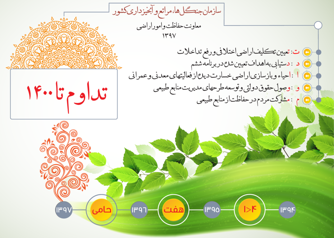معاونت حفاظت و امور اراضی با هدف کاهش عوامل تخریب در عرصه های منابع طبیعی، اقدامات خود را در قالب طرح "تداوم تا 1400" عملیاتی می کند.