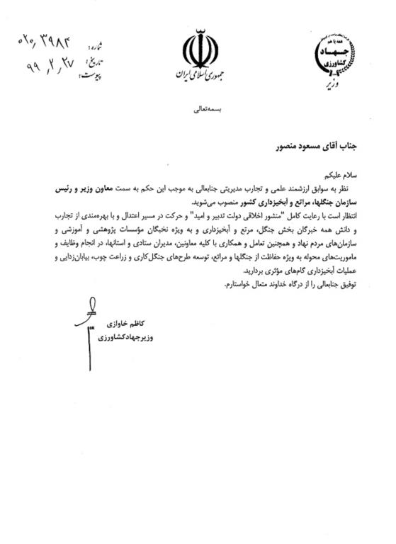 مسعود منصور به عنوان معاون وزیر جهاد کشاورزی و رئیس سازمان جنگلها، مراتع و آبخیزداری کشور منصوب شد