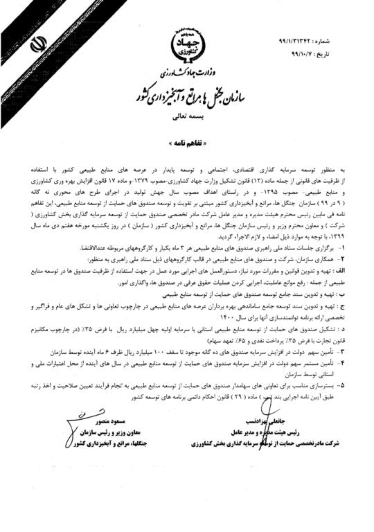Based on the report, the memorandum is signed by Jan-Ali Behzad-Nasab, Directing Manager of ASSHC and Head of SFIDA, and Massoud Mansour, Deputy Minister of Agriculture and Head of FRWO in five articles.
