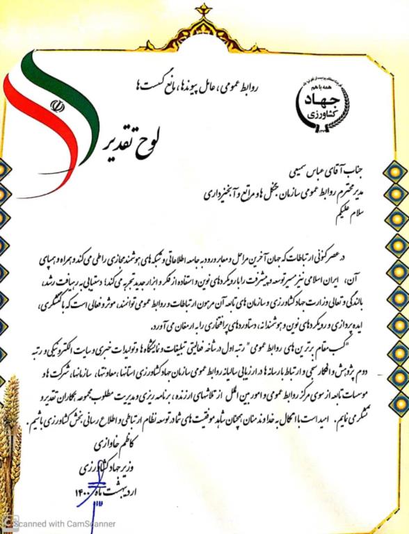 به گزارش مرکز اطلاع رسانی سازمان جنگل ها، متن لوح تقدیر وزیر جهاد کشاورزی خطاب به مدیرکل روابط عمومی و امور بین الملل سازمان جنگل ها، مراتع و آبخیزداری کشور بدین شرح است: