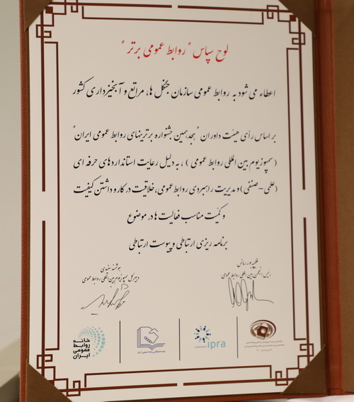 به گزارش پایگاه اطلاع رسانی سازمان جنگلها، مراتع و آبخیزداری کشور - در بخش معرفی برترینها، روابط عمومی سازمان جنگل ها، مراتع و آبخیزداری کشور با کسب بالاترین امتیاز از ارزیابی های علمی و تخصصی صورت گرفته به دلیل رعایت استانداردهای حرفهای (علمی - صنفی) و مدیریت راهبردی روابط عمومی، خلاقیت در کار و داشتن کیفیت و کمیت مناسب فعالیت ها در موضوع برنامه ریزی ارتباطی و پیوست ارتباطی موفق به دریافت لوح سپاس "روابط عمومی برتر" گردید.