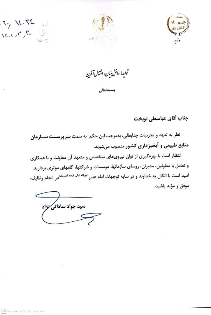 متن حکم انتصاب سرپرست سازمان منابع طبیعی و آبخیزداری کشور به شرح ذیل است: