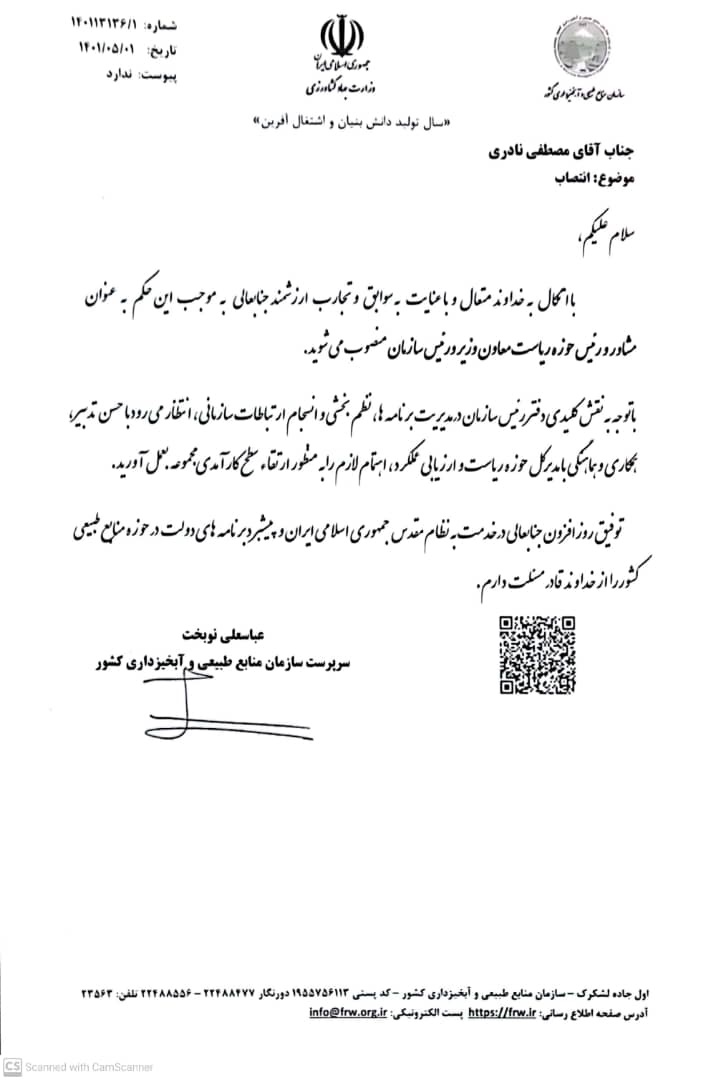 دکتر مصطفی نادری به عنوان مشاور و رئیس حوزه ریاست سازمان منابعطبیعی و آبخیزداری منصوب شد