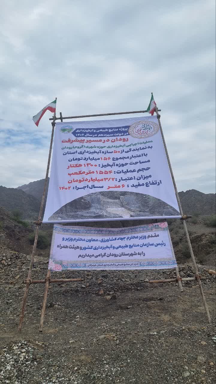 به گزارش پایگاه اطلاع رسانی سازمان منابع طبیعی و آبخیزداری کشور با حضور دکتر نوبخت در منطقه گروم شهرستان رودان، یک طرح آبخیزداری حوزه شهری به نمایندگی از 50 طرح آبخیزداری که جمعا با صرف 156 میلیارد تومان در پهنه 1300 هکتار از اراضی استان هرمزگان اجرا شده اند افتتاح شد.